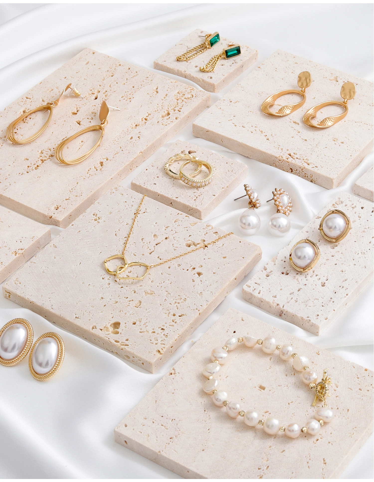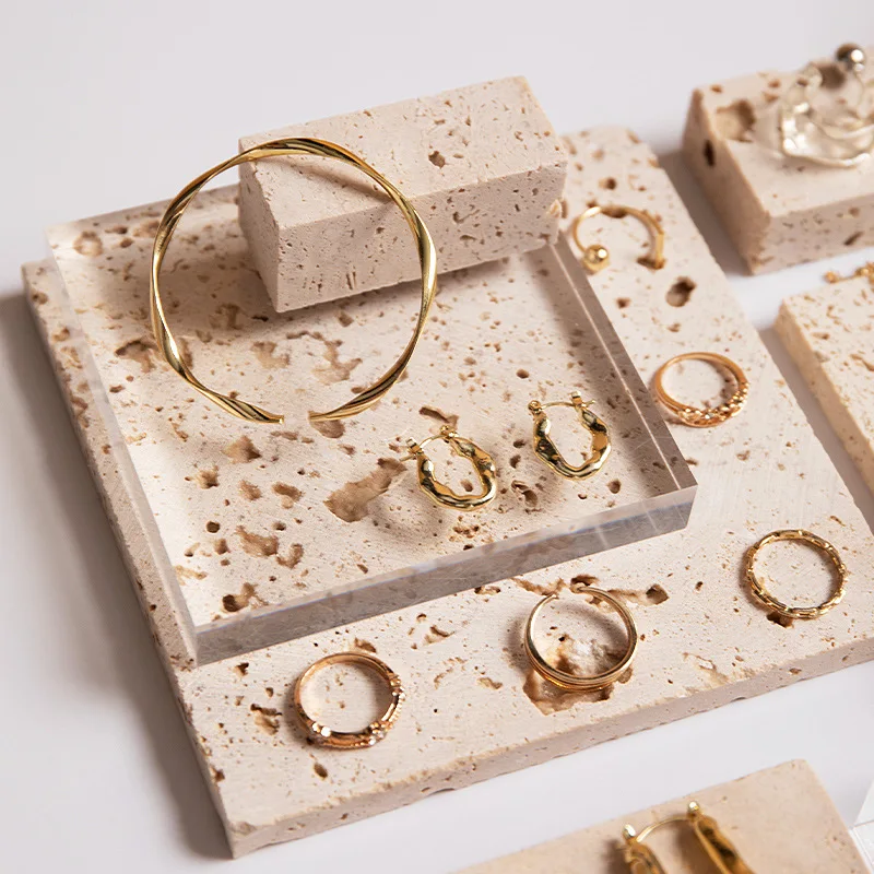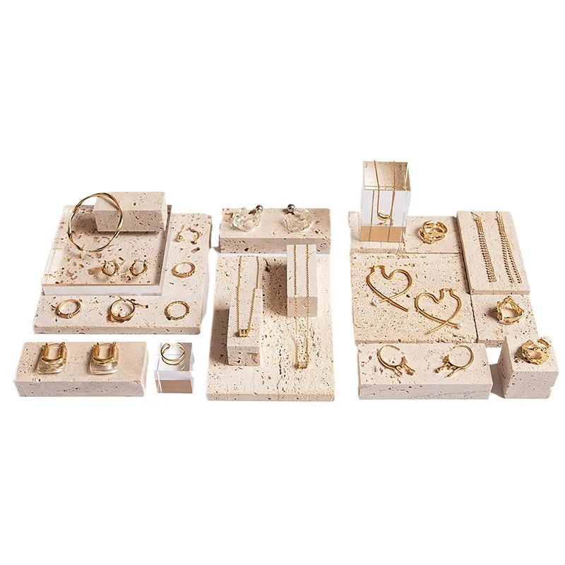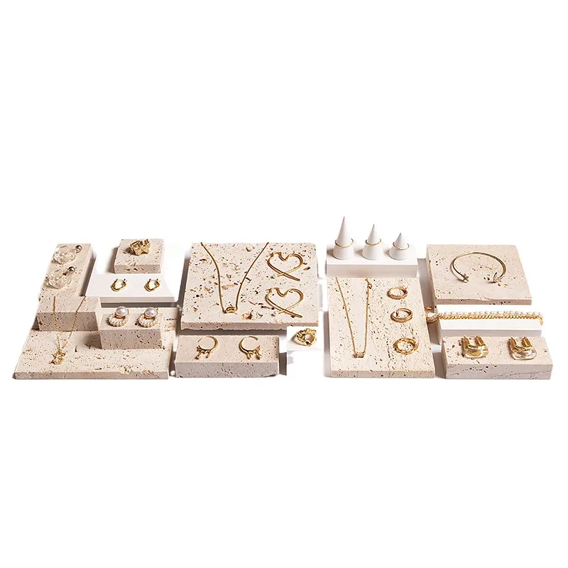 High End Natural Stone Beige Travertine Decorative Jewelry Tray Display Stand Set