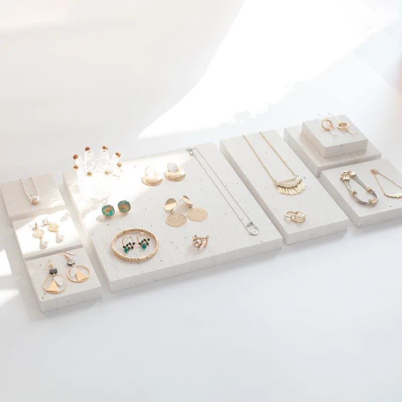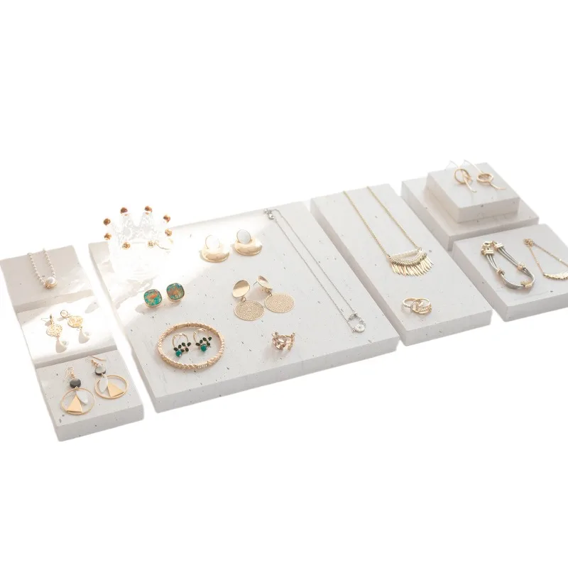 High End White Marble Geometric Stone Jewelry Display Stand Display Set