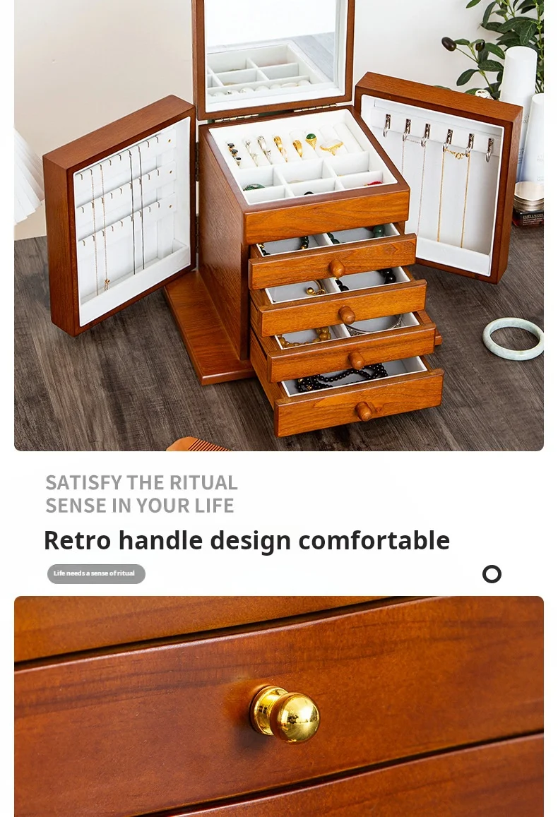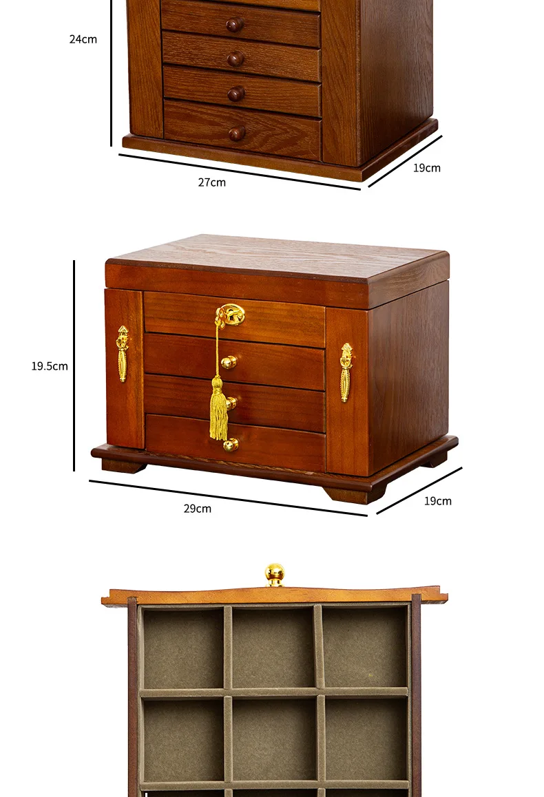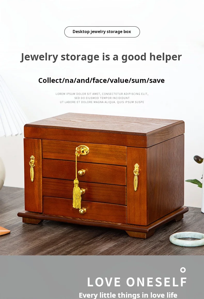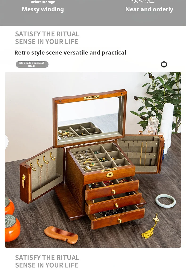 Solid Wood Large-capacity Three-layer Earring Jewelry Storage Box with Lid and Lock